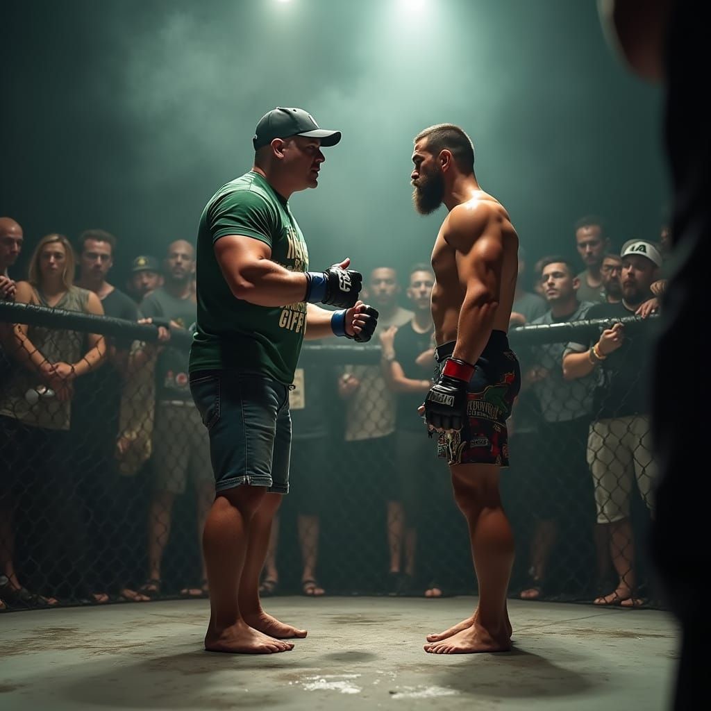 This image shows a dramatic, high-contrast face-off between John Cena and Khabib Nurmagomedov in a gritty underground fight arena, with a smoky atmosphere and fans pressed against the cage.
