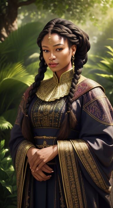 This image shows a stunning, photorealistic portrait of a woman standing in a lush garden, with intricate braids and elegant attire, under warm golden hour light.