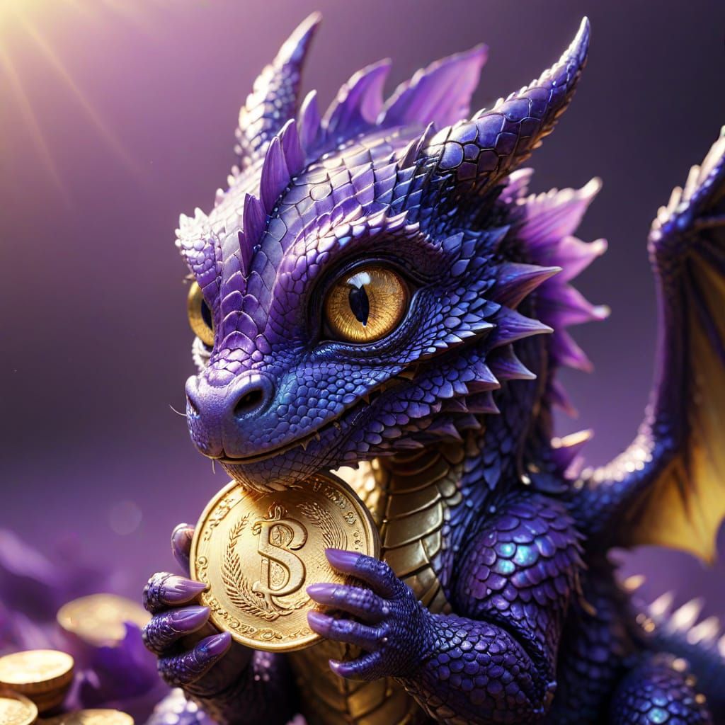 A striking picture of a baby dragon clutching a large gold coin. The fantasy art is rendered with high contrast, vibrant colors, and detailed textures, emphasizing the dragon's shimmering purple eyes.