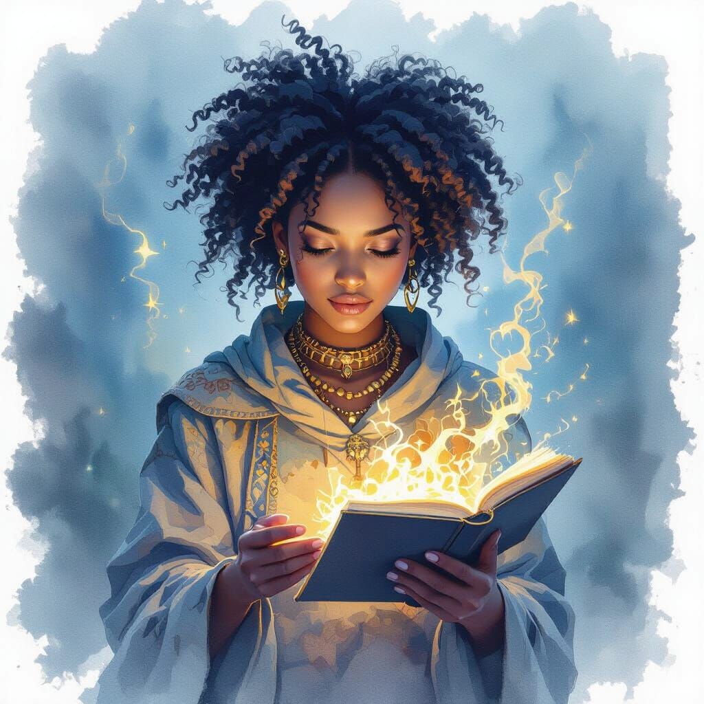 This image depicts ageless Afrofuturistic characters creating magical spells like a calligrapher. Rendered in a semi-realistic, melancholic watercolor style with cinematic blue hour lighting.