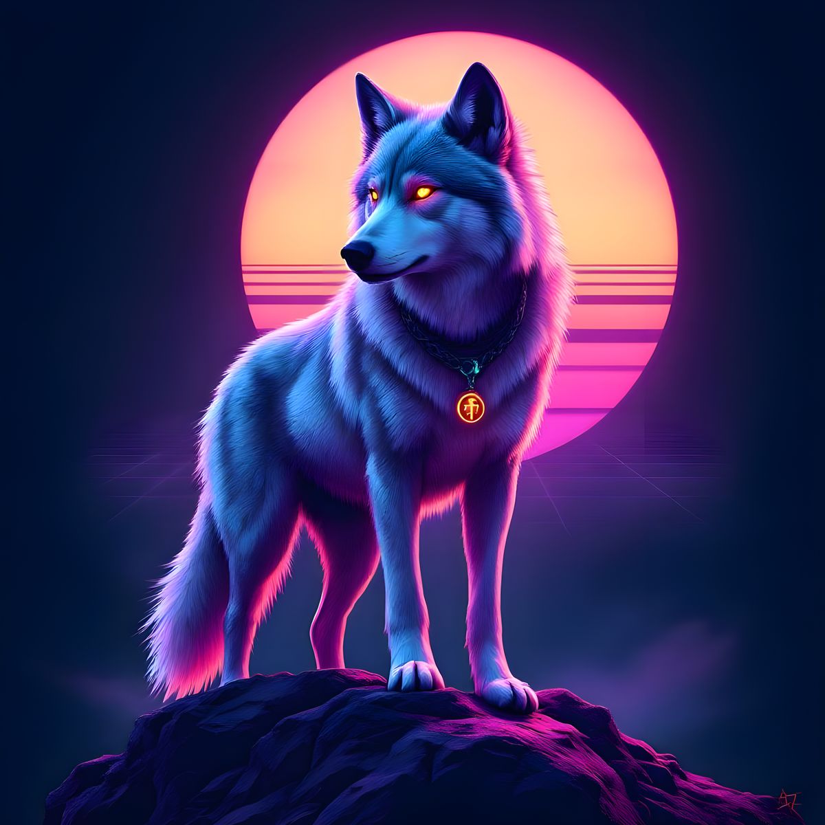 This image shows a rim-lit arctic wolf with neon highlights standing on a rock. The wolf features amber eyes, a scar, and a braided leather collar against a synthwave background, rendered as digital art.