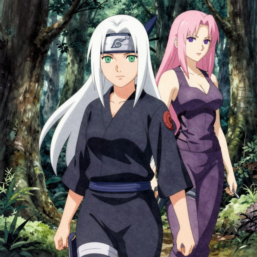 This image shows two female ninjas, one with white hair and green eyes, the other with pink hair and violet eyes, exploring a creepy forest. The artwork is in a watercolor anime style with deep colors and cel-shading.