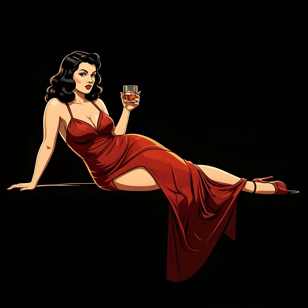 This image is a vibrant, highly detailed pinup of a woman in a golden hour pose, showcasing her luscious curves and bold lines, reminiscent of classic American pinup art from the mid-20th century.