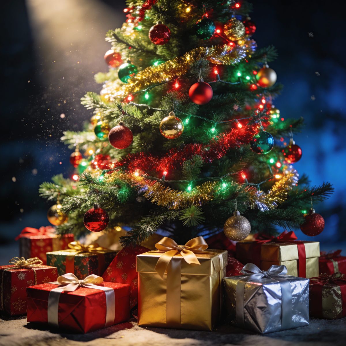 This image shows a photorealistic, highly detailed Christmas tree illuminated by cinematic lighting. It is covered in ornaments and surrounded by gifts.