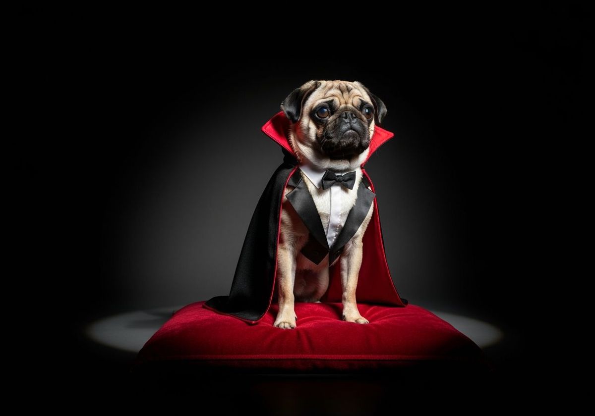 A grumpy pug in a Dracula cape and tuxedo sits on a velvet cushion under a spotlight. Whimsical oil painting with photorealistic details and dramatic lighting.