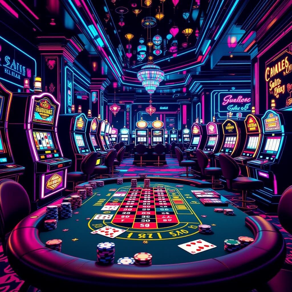 A vibrant online casino scene featuring slot machines, roulette tables, lucky chips and cards. Bold neon lights and luxurious textures create a striking image in a colourful, high contrast style.