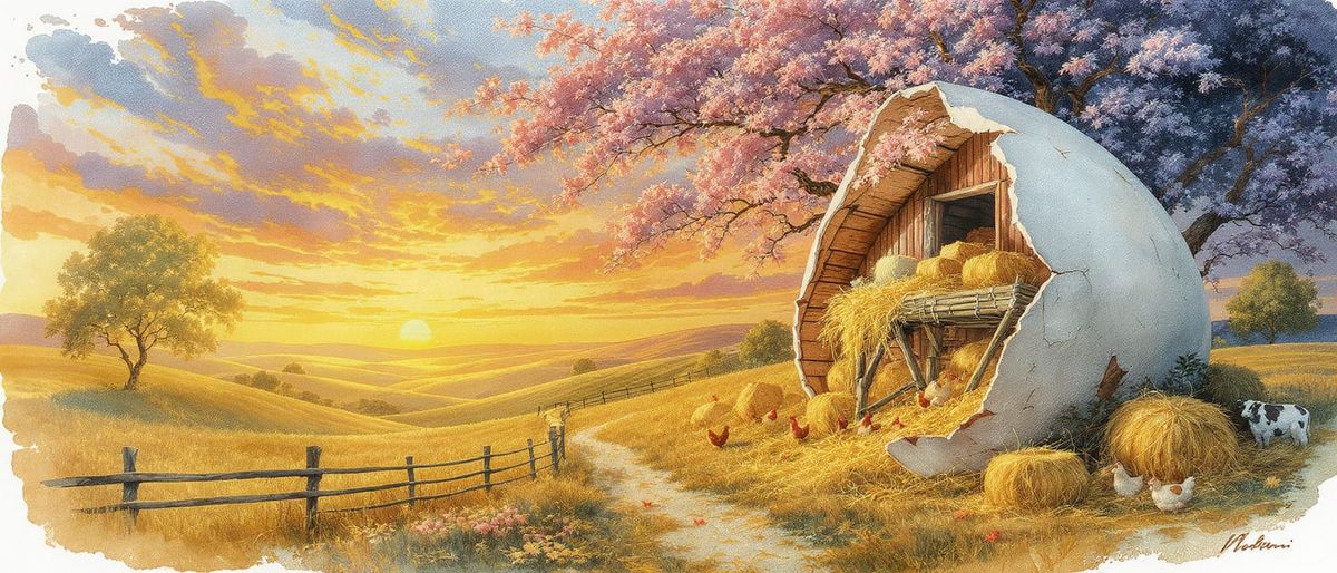 A surreal image of a farm nestled inside a cracked egg. The artwork depicts a vibrant sunset scene with chickens, cows, a barn, and haybales in an impressionistic style.
