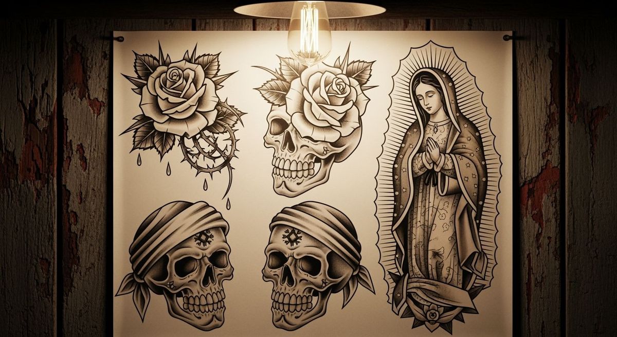 This image shows a Chicano-style tattoo flash sheet on a vintage tattoo shop wall. The black and grey designs feature roses, skulls, and the Virgin Mary, using bold lines and fine shading. The style resembles classic tattoo art.