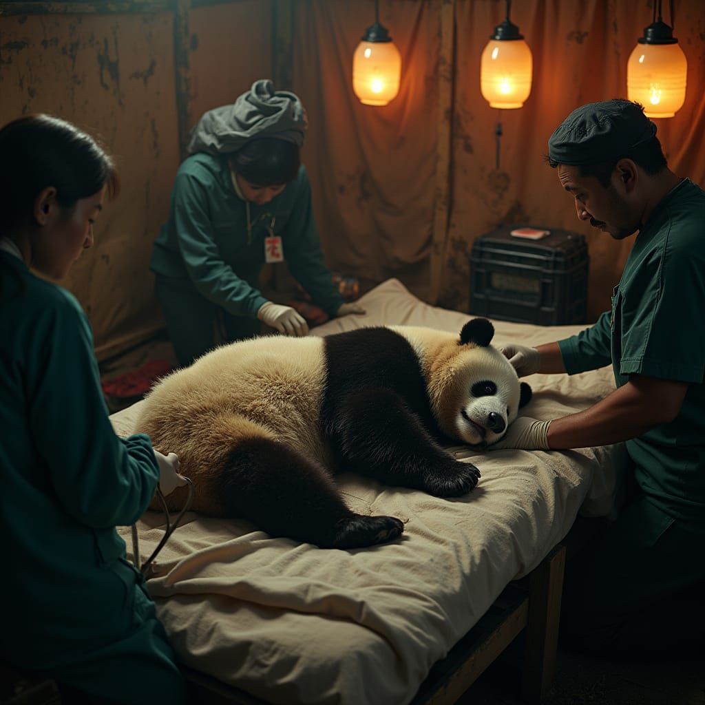 A poignant scene of medical volunteers tending to a wounded panda in a relief tent, illuminated by the warm glow of lanterns, amidst a backdrop of medical supplies and rugged fabric, evoking the emotional depth of humanitarian photography.