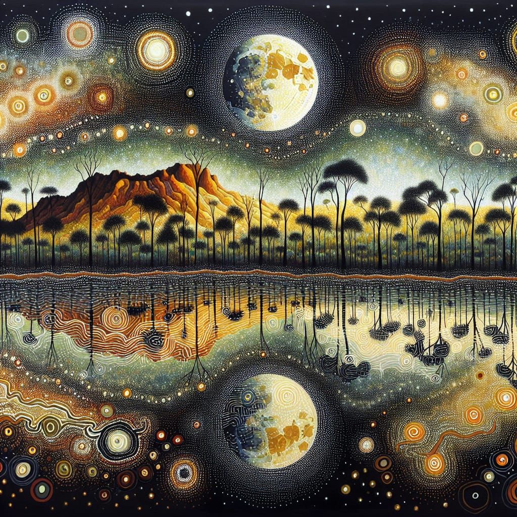 A vibrant Australian moon landscape rendered with pre-1912 artistic techniques. The image integrates Aboriginal dot art with radiant cream, ochre, and white colors on a stark black background, using chiaroscuro to enhance detail.