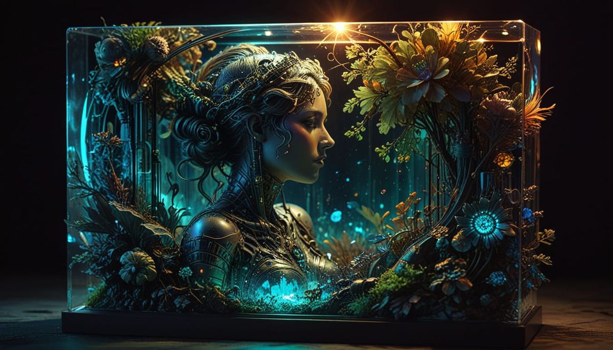 This image shows an intricate Lichtenberg figure encased in a glass block, illuminated by an ethereal glow. The artwork evokes a dystopian, steampunk aesthetic with volumetric and dynamic lighting.