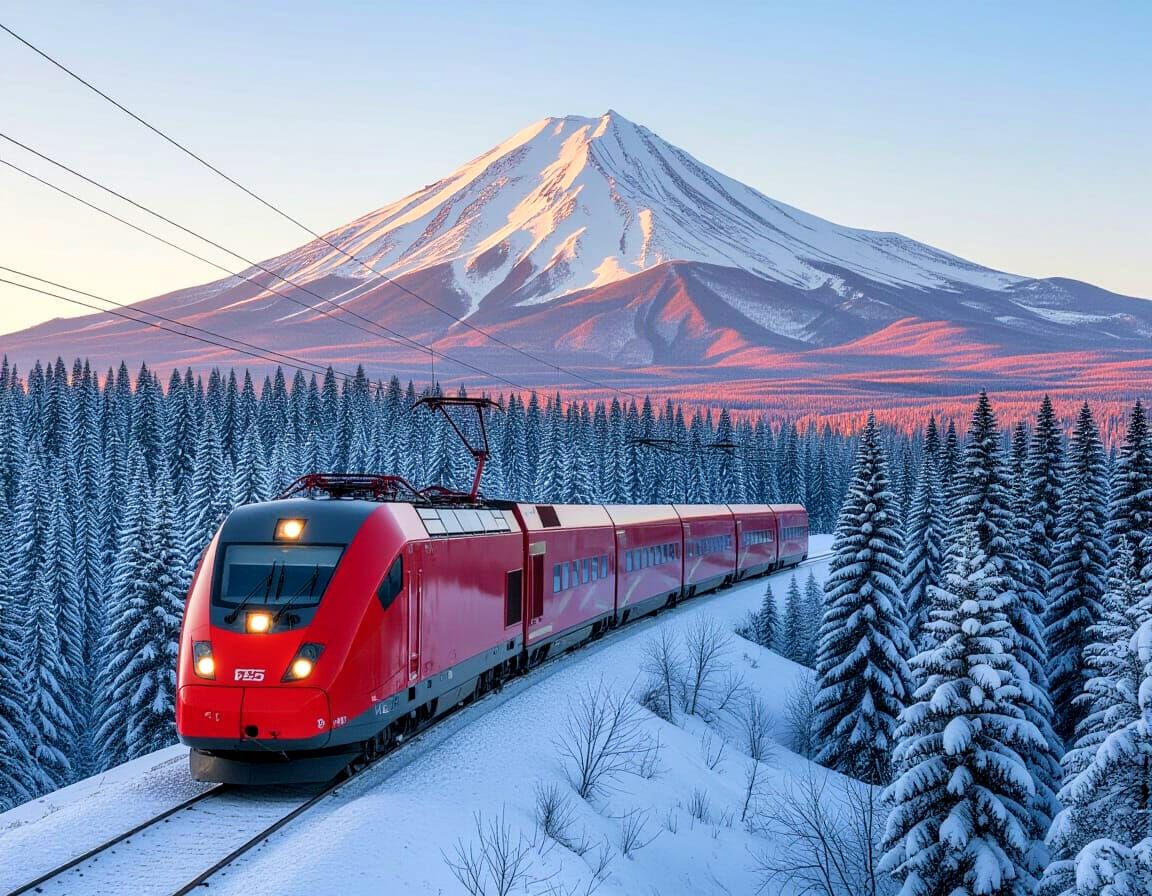 This image shows a high-resolution photograph of a modern Russian TGV train traversing a snowy forest. Shot from a drone's perspective, it features vibrant colors and an artificial winter lighting scheme.