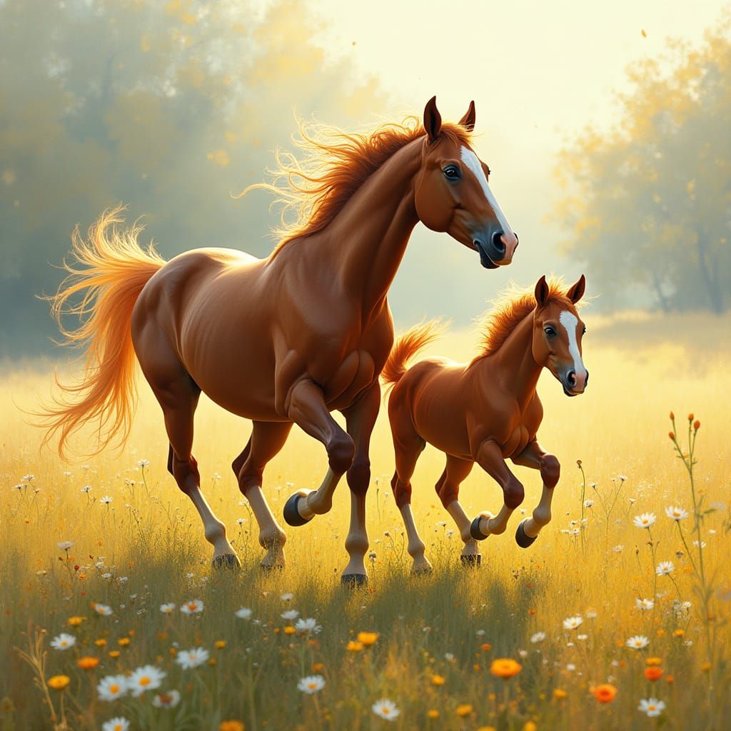 A vibrant image shows a majestic horse and its foal running through a wildflower meadow bathed in golden sunlight. The image is reminiscent of impressionist paintings.