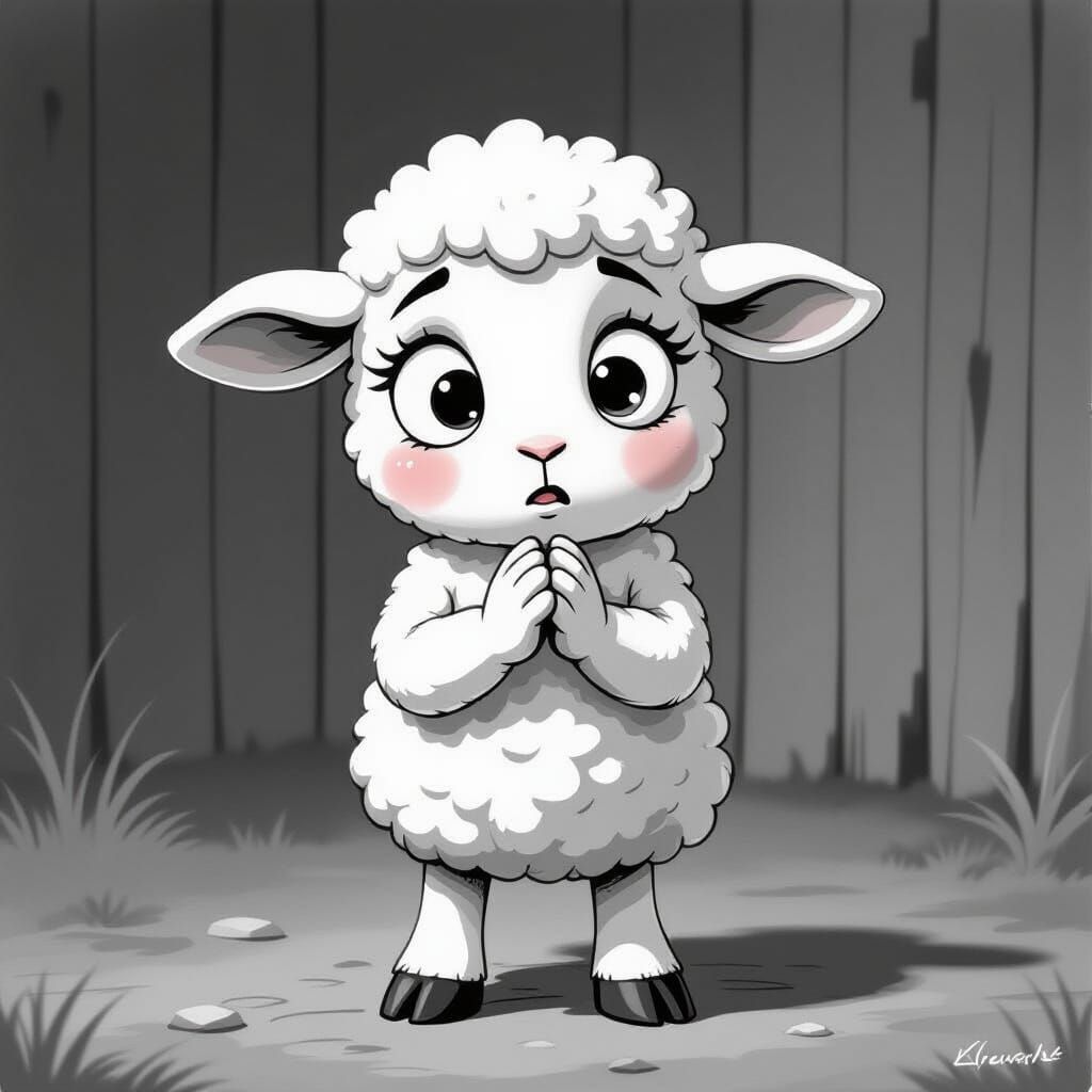 This image shows a worried lamb with exaggerated features in a vintage black and white cartoon style. It evokes the style of 1930s animation, with a blend of humor and slight grotesqueness.