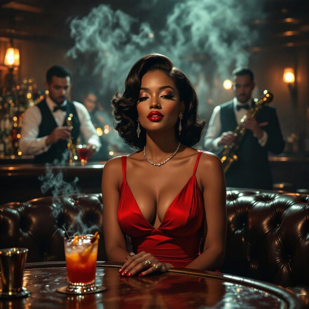 This image shows a jazz band performing in a smoky hotel bar. A Black female singer in a red dress sings while a bartender serves cocktails in a retro aesthetic.