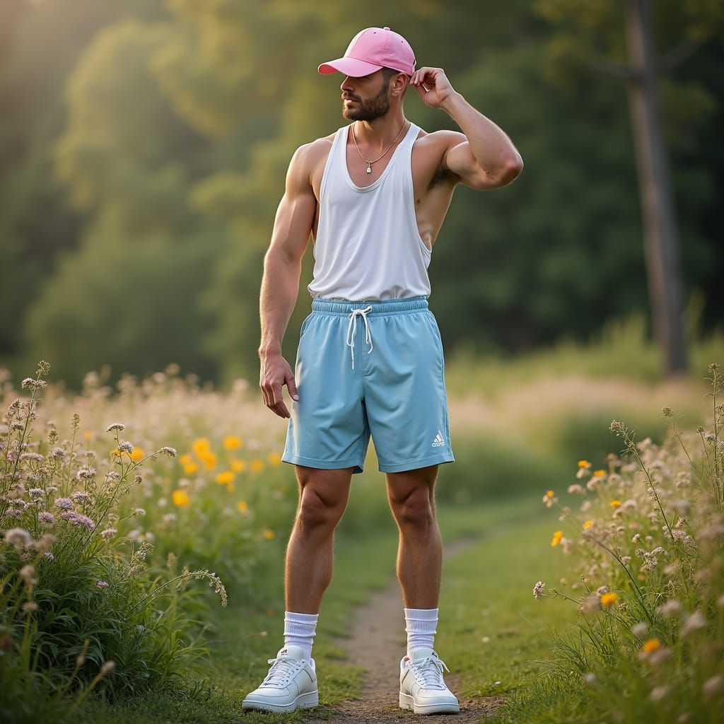 A striking image of a muscular man in a verdant countryside. The scene features soft, romantic lighting and focuses on realistic details, in a style reminiscent of romantic realism.