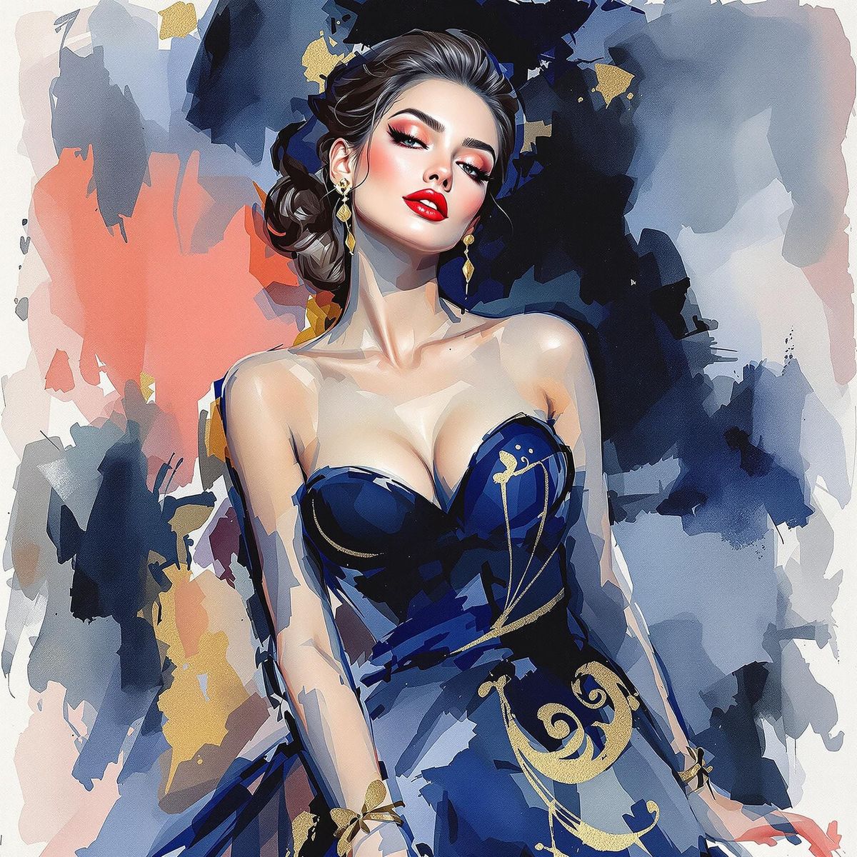 A vibrant watercolor painting of an elegant woman in a graceful pose. The artwork blends rich colors with expressive brushstrokes to create a stylized, intimate atmosphere.