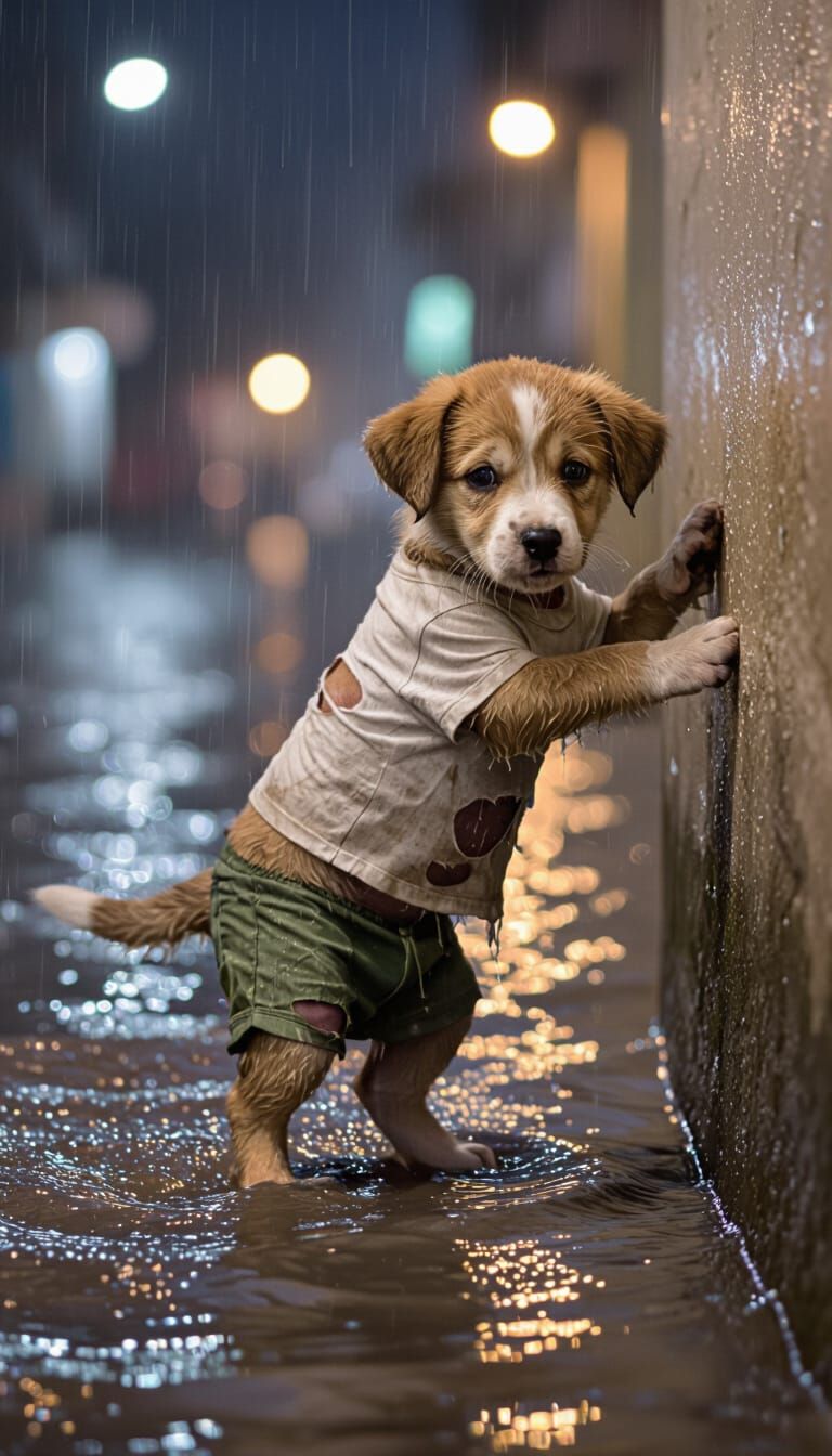 This image shows a small, wet puppy clinging to a wall on a flooded street. The puppy is wearing tattered clothes and looks scared as heavy rain pours down, creating a scene of vulnerability.
