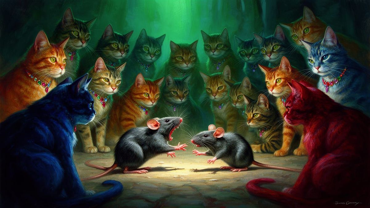 This oil painting depicts 15 vibrant cats observing a no-rules fight between two rats, anticipating the victor. Created in the style of James Gurney.