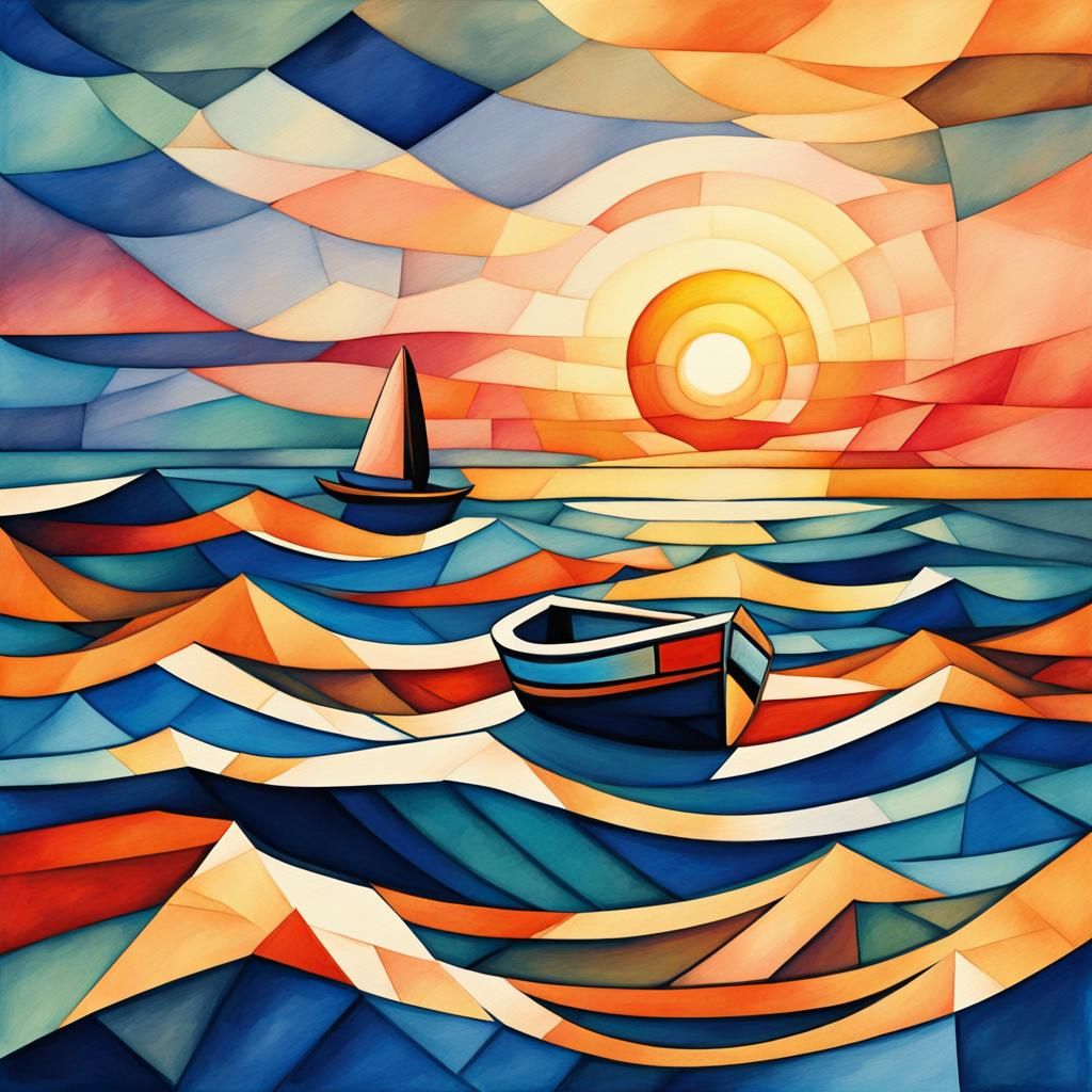 A vibrant watercolor of sea waves and a boat at sunset, rendered in a cubist style. The artwork features complementary colors and layered geometry, reminiscent of art deco and geometric fauvism.