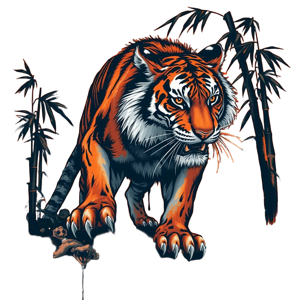 This image shows a grunge-style tiger logo in rich colors against a burnt orange backdrop. The design incorporates elements of bamboo thickets and ancient ruins with gritty textures as digital art.