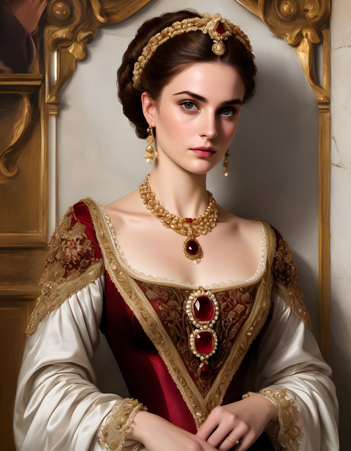 This portrait depicts a stunning Italian noblewoman in the Renaissance style, dressed in a rich crimson velvet gamurra with intricate gold embroidery and adorned with precious jewels. Her long, auburn hair is styled with a delicate gold net and pearls, while a pendant ruby and gold rings add to her regal...