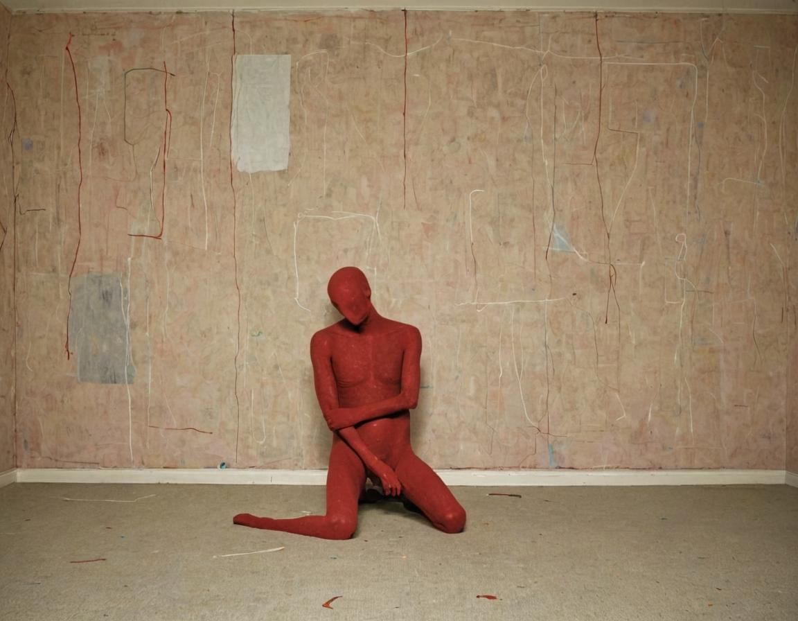 A medium shot of a red, faceless figure in a retro-modern room, expressing pain. The image is in an abstract expressionist style with Basquiat-like scribbles and soft lighting. The palette consists of muted pastels and vibrant pops of color, creating an eerie, ominous mood.