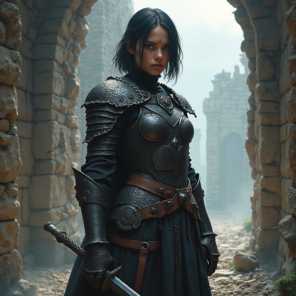 This enchanting image shows a sturdy female dwarf warrior standing proudly amidst ancient castle ruins, her intricate black chainmail armor and burn scar on her left cheek a testament to her unyielding spirit, surrounded by delicate mist and rendered with meticulous accuracy in a dreamlike, hyper-detaile...