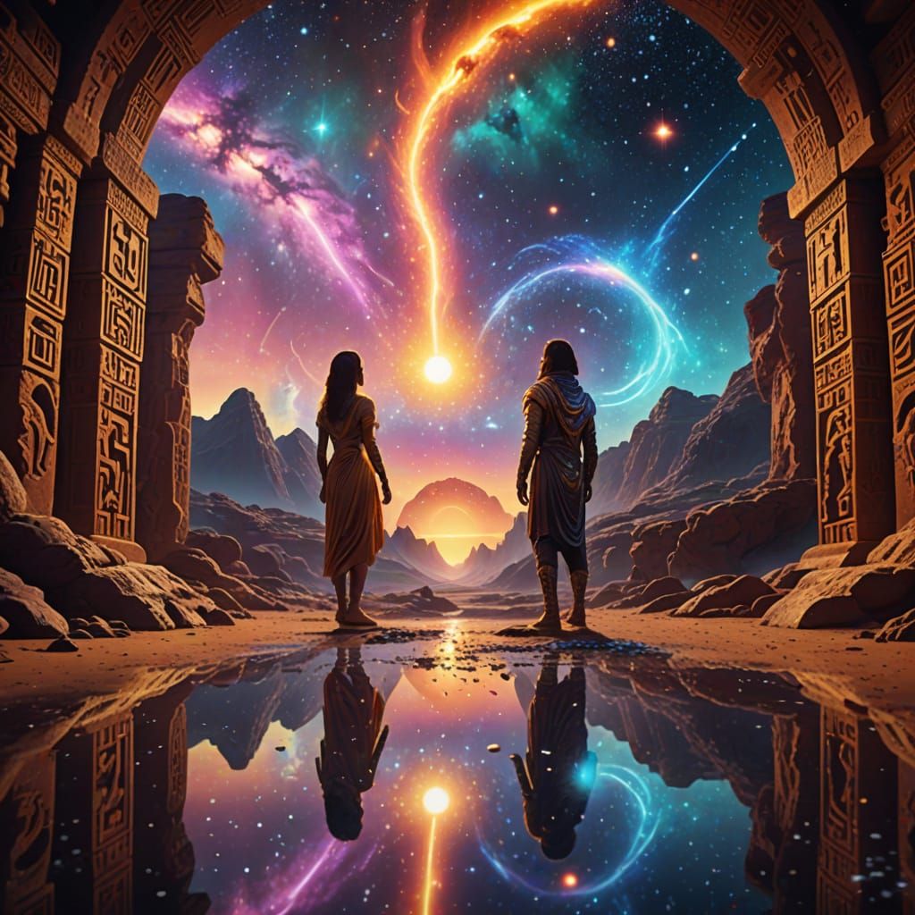 A cinematic film still of a majestic spirit animal reflected in a colorful, swirling galaxy, set against a backdrop of glowing celestial beings, ancient alien hieroglyphs, and vibrant, triadic colors under golden hour lighting.