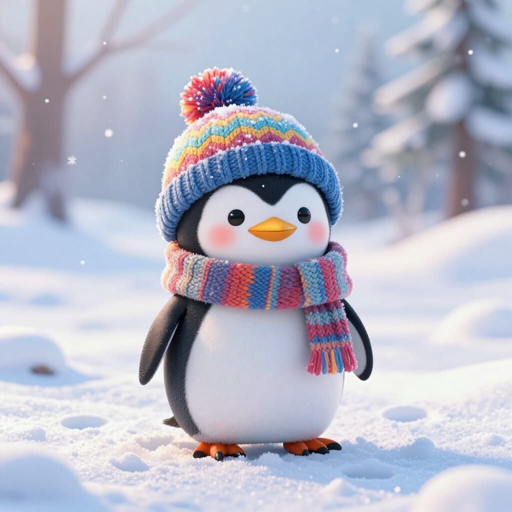 This image shows a cute penguin in fresh snow wearing a hat and scarf. Rendered in a whimsical animated style with vibrant colors and soft lighting.