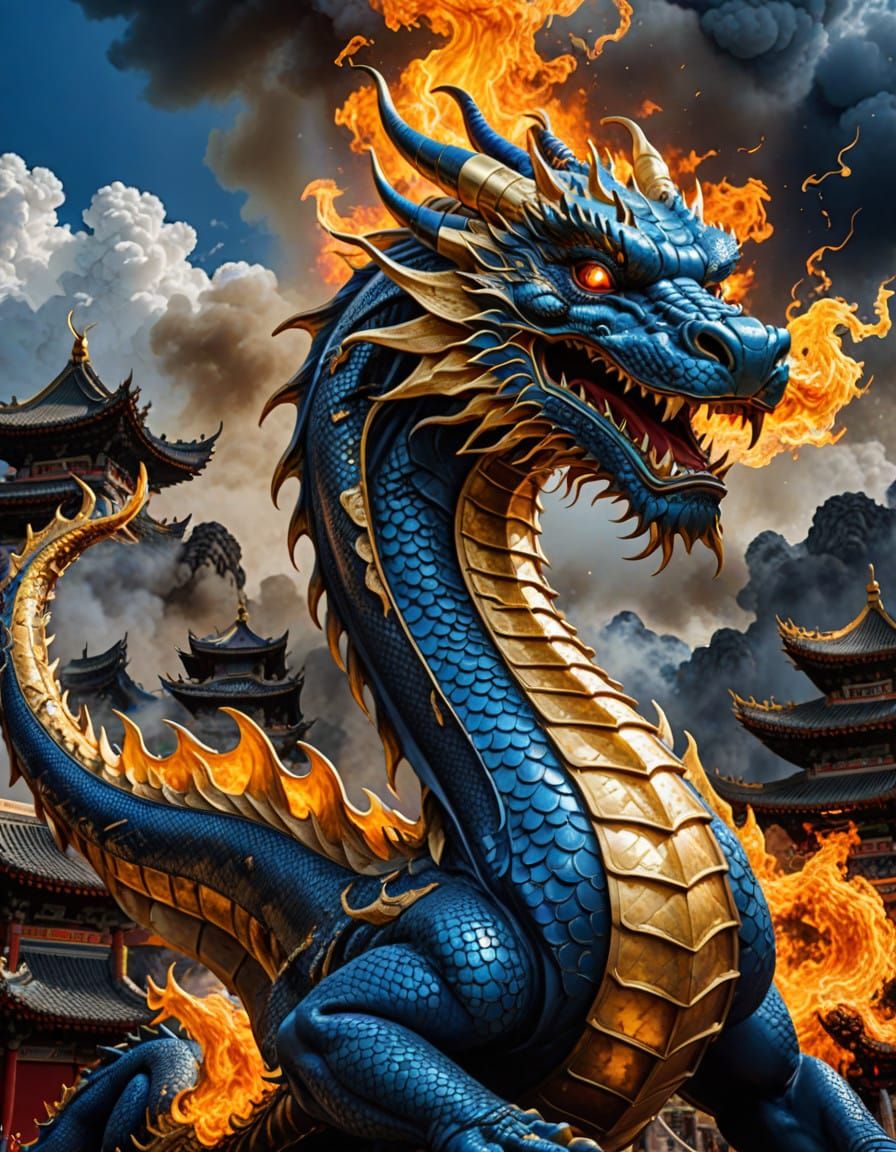 A striking picture of a slender, elegant sapphire and gold dragon in flight. The dragon soars amid a stormy sky, breathing fire in this image of Chinese iconography.