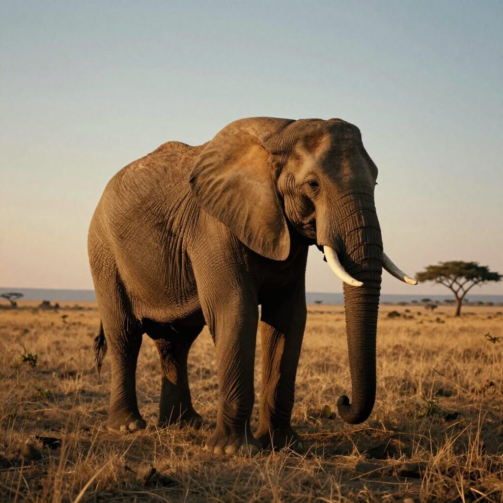 Cinematic film still of a majestic elephant on a vast savanna during golden hour. Features atmospheric lighting, subtle film grain, and expert color grading for a stunning, detailed masterpiece.