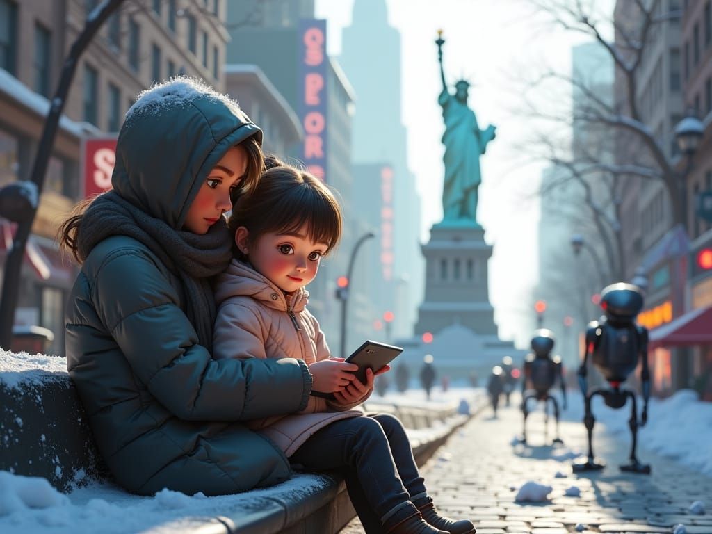 This image shows a poignant winter scene in a desolate New York City, where broken robots line the sidewalk, amidst a foggy, mid-day atmosphere. A young girl sits beside her mother, lost in thought, as the Statue of Liberty stands in the background, in a 3D cartoon style with Pixar-inspired details and c...