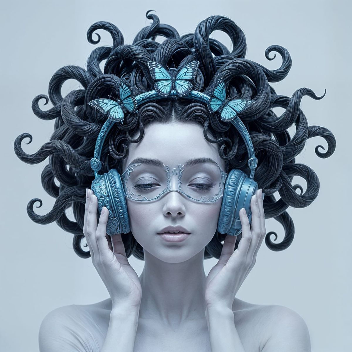 This image shows a porcelain-skinned woman with Medusa-inspired hair. The 3D digital artwork features intricate details and a surreal, otherworldly aesthetic. She wears a blindfold and blue headphones, contrasting technology and mythology.