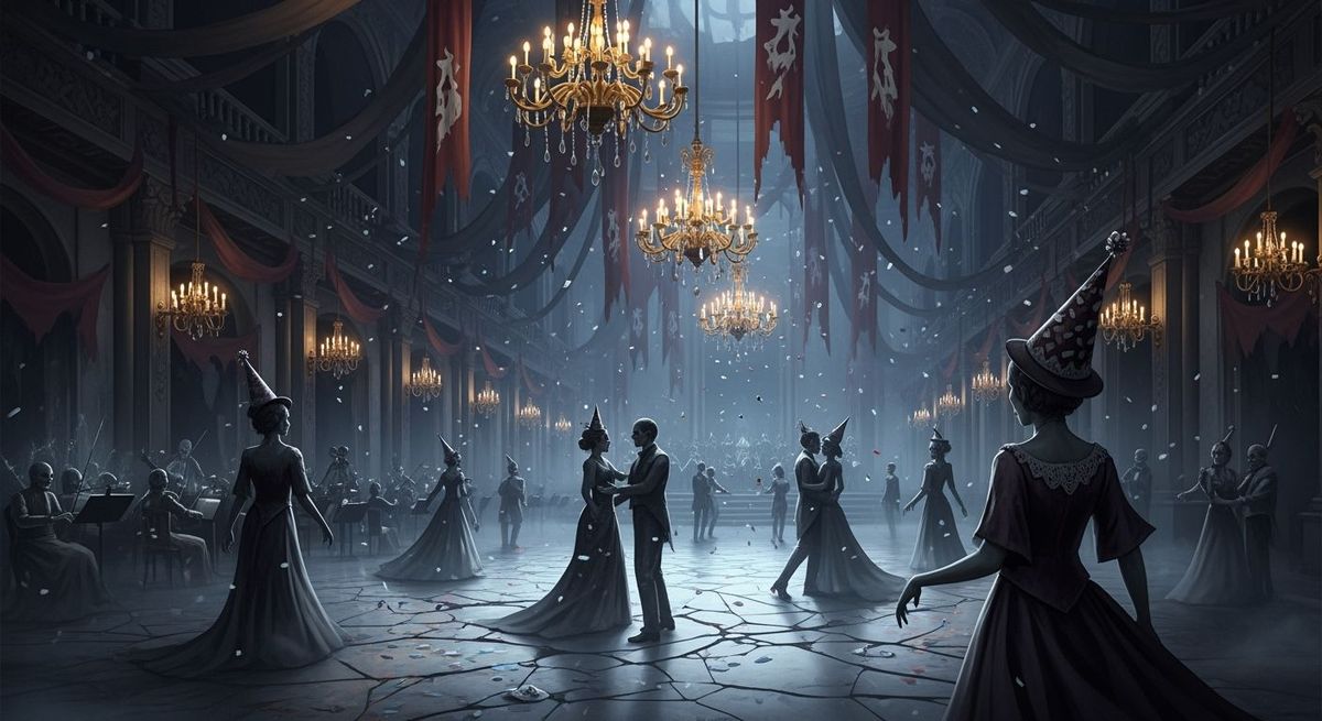 This image depicts a dark fantasy New Year's Eve in an opulent ballroom with ethereal guests. Cinematic lighting and a painterly texture create a hauntingly beautiful gothic atmosphere.