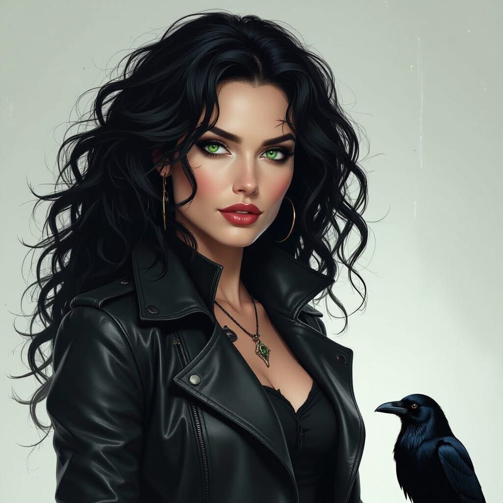 This image shows a striking scientist-witch with a raven familiar in a cinematic scene. The portrait uses noir aesthetics and subtle lighting to highlight her features and create a sense of fierce elegance.