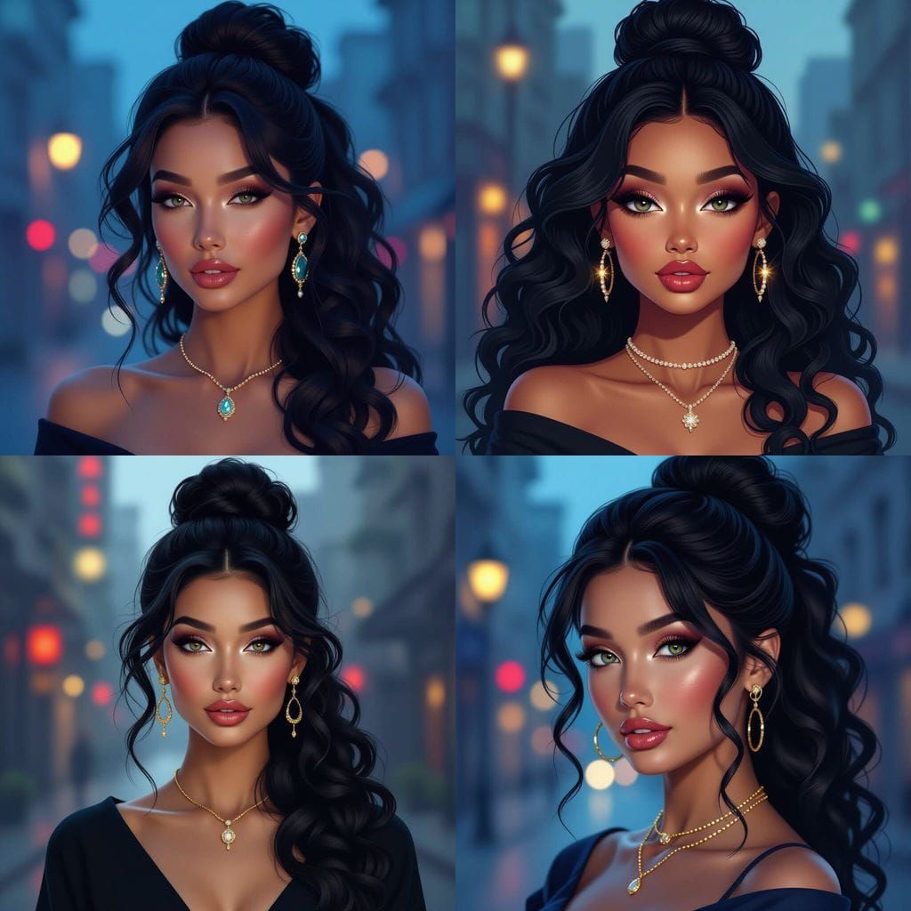 A hyperrealistic digital illustration of a woman with long, curly black hair and doll-like features, adorned with makeup and jewelry, set against dark urban backdrops.