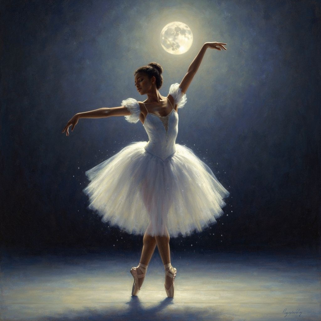 This image shows a Black ballerina dancing on a stage bathed in moonlight. Her white tutu flows around her as she moves with ethereal grace in an impressionistic style.