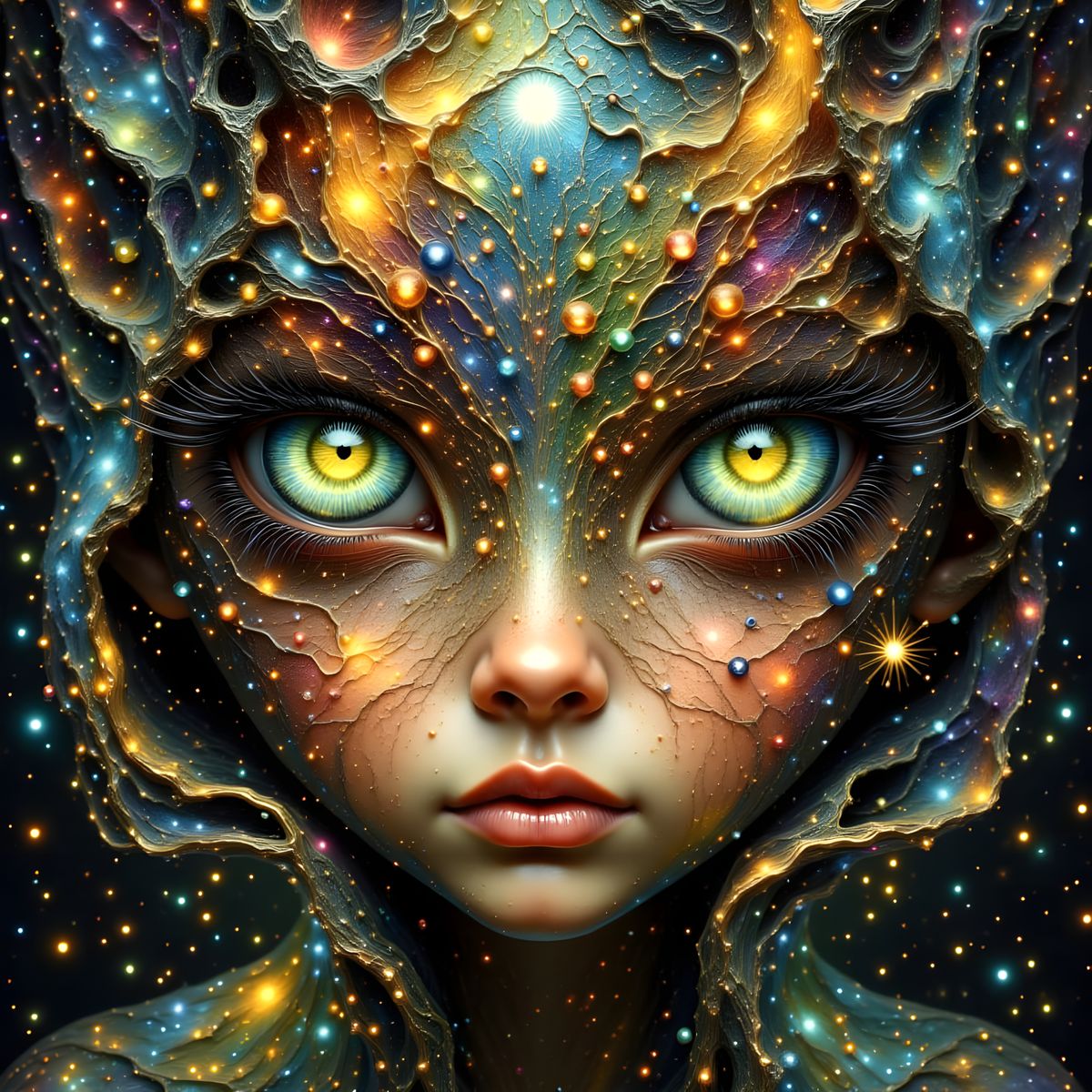 This image showcases a photorealistic, adorable baby comet with multiple eyes, surrounded by stardust and nebulae. It features intricate details and a captivating cosmic glow.