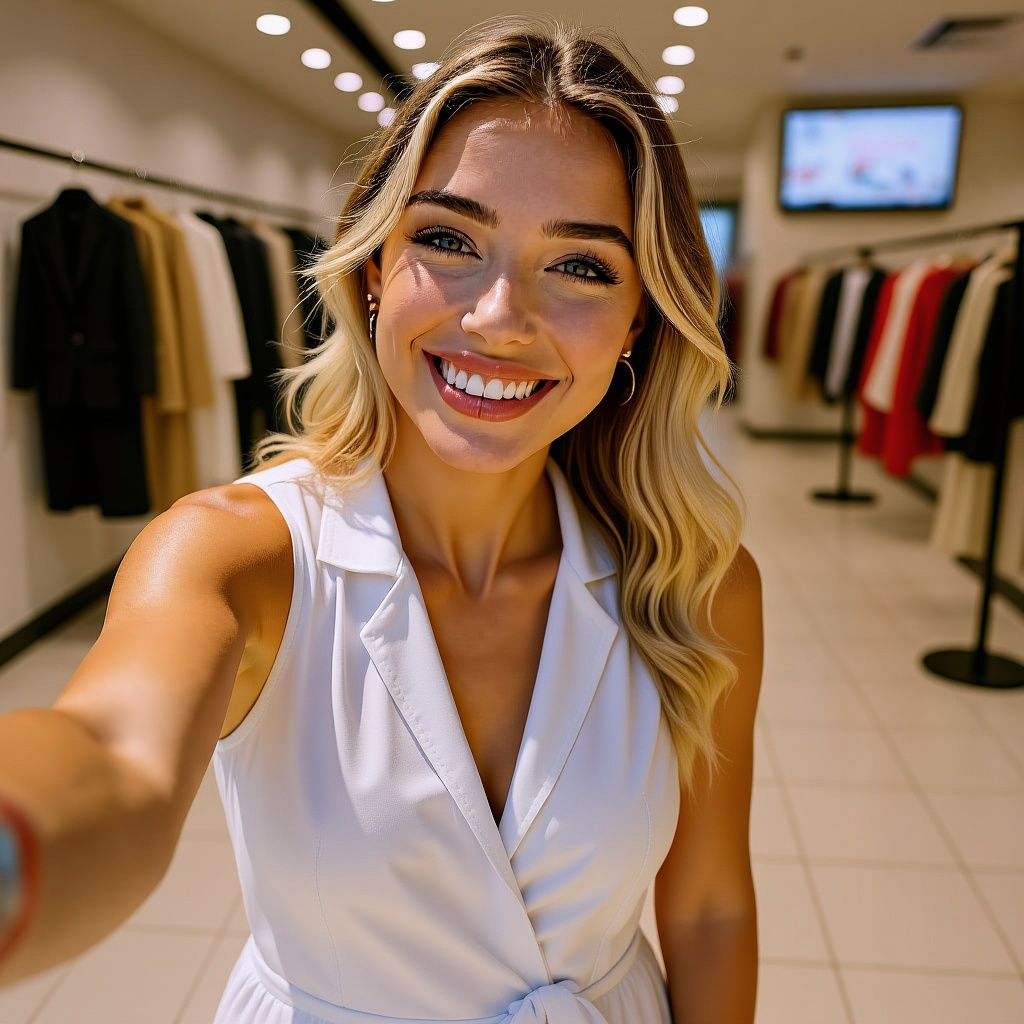 A vivid image captures a blonde 23-year-old Brazilian woman in a bikini taking a selfie by a pool. The photo highlights her natural beauty in a casual setting.