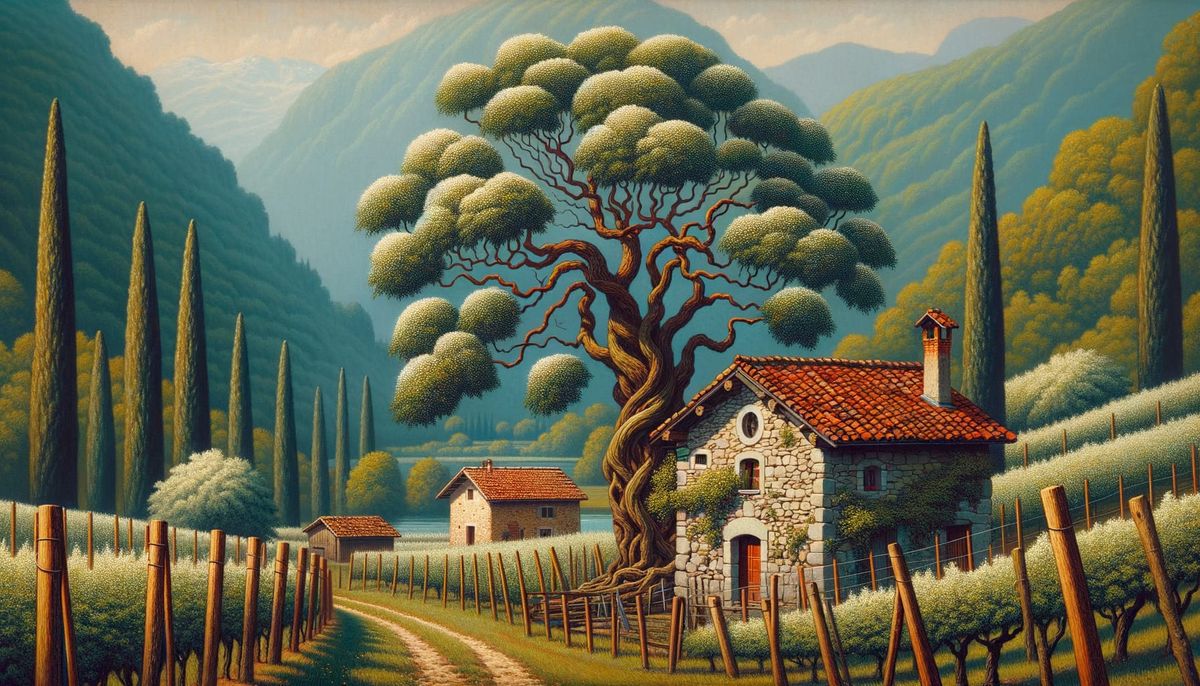 This image shows a chestnut tree beside a stone building with a red roof, set in the Italian countryside. Vineyards, cypresses, and olive groves complete the tranquil, rural scene in a Soviet Realism style.