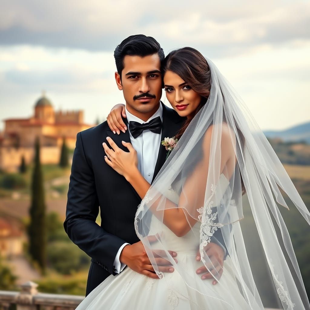 This image depicts a handsome couple embracing in a picturesque Tuscan setting, reminiscent of classic romantic art. The woman wears a elegant wedding gown and cathedral veil, while the man sports a stylish tuxedo.