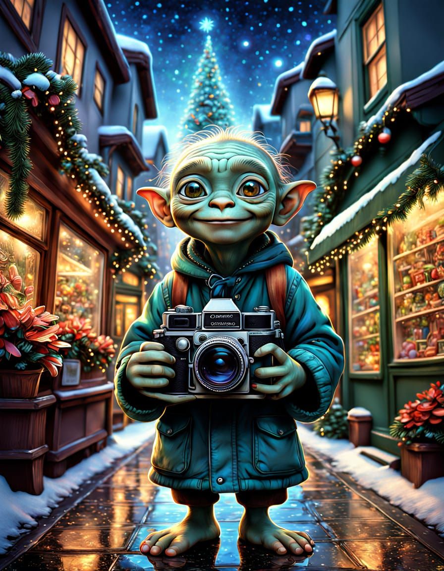This image shows a studio filled with vintage film cameras and lighting. A photographer works on a city street with framed photos displayed on a wall, rendered with HDR and fantasy elements.