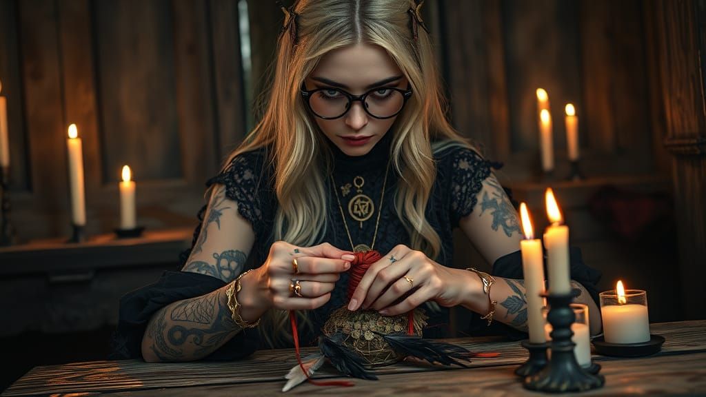 This image features a mystical blonde gothic woman with green eyes in a candlelit shrine. She wears a tattered lace dress and tattoos, focused on a ritual bundle. The atmosphere is spiritual and reverent, rendered with graffiti and splash art influences.