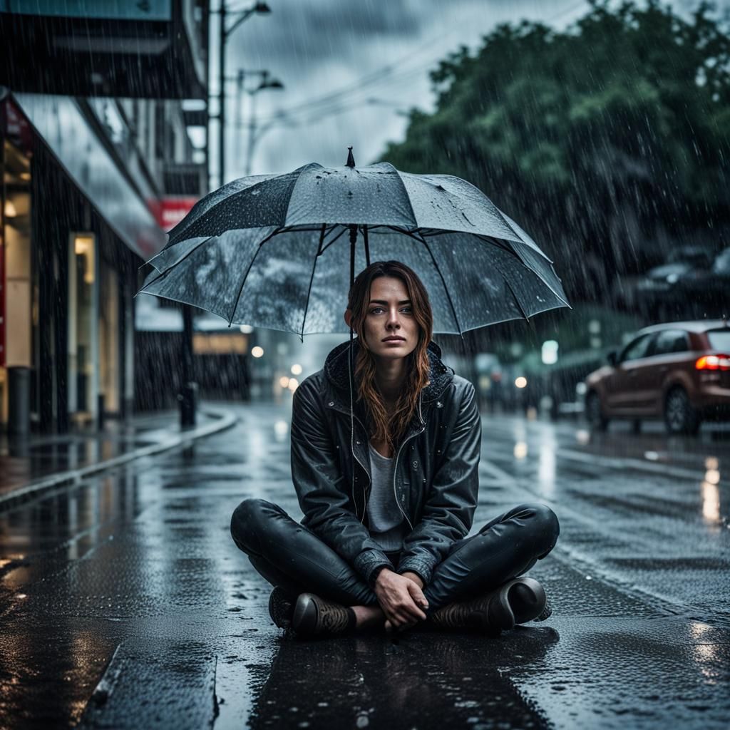 This image shows a young woman sitting on the ground in the rain in a post-apocalyptic environment. The digital photograph captures a rainy, ultra-realistic, and moody scene with a wide field of view.