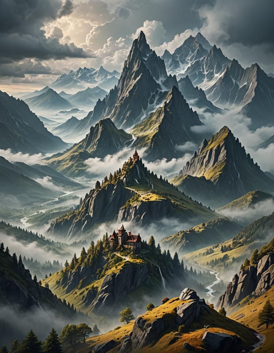 This image shows a breathtaking mountain landscape shrouded in mist. The digital matte painting style creates a dramatic and atmospheric scene, meticulously detailed and visually stunning.