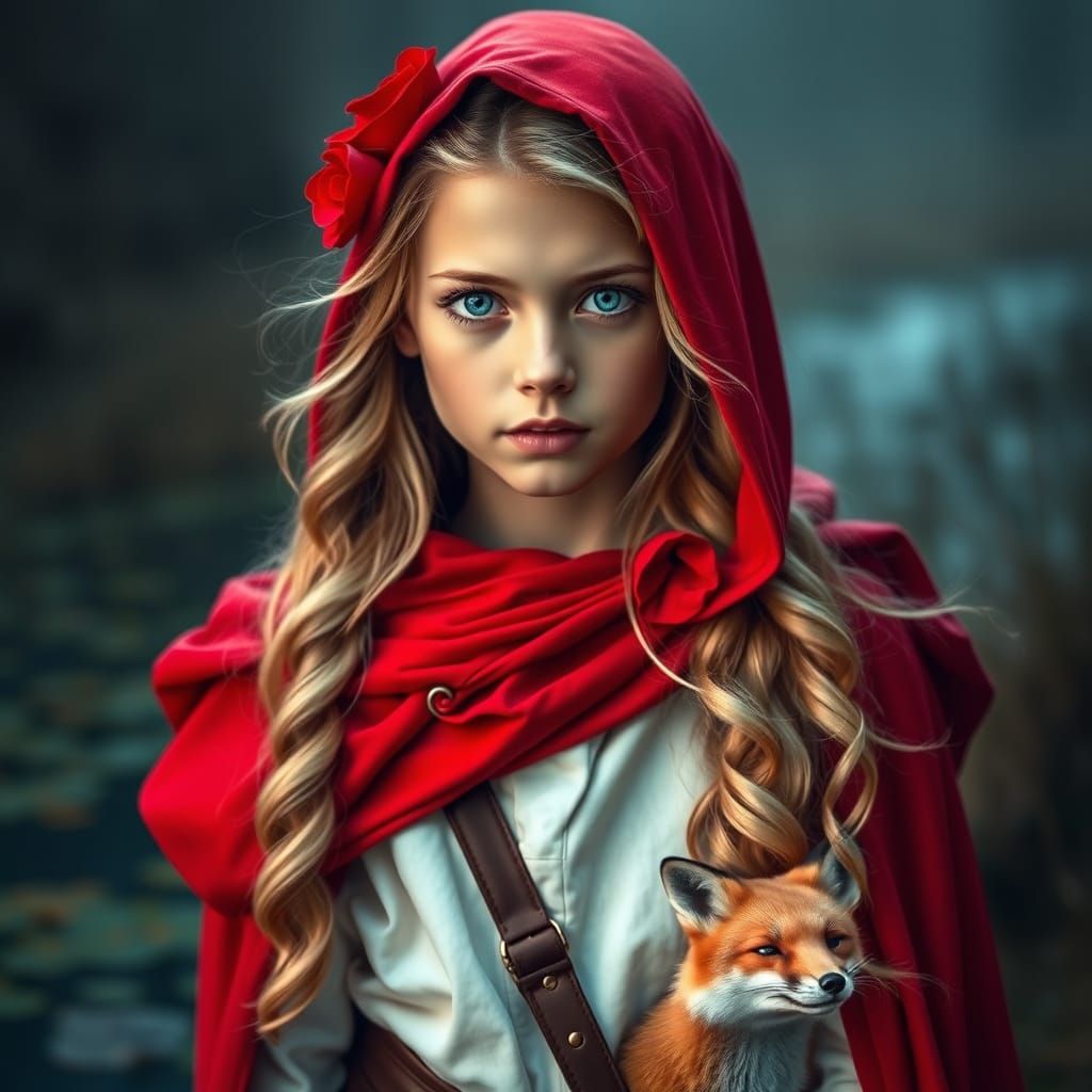 A serene young princess with golden hair and blue eyes sits beside a pond, surrounded by a fox and red roses, in a hauntingly beautiful and cinematic scene with intricate details and high contrast.