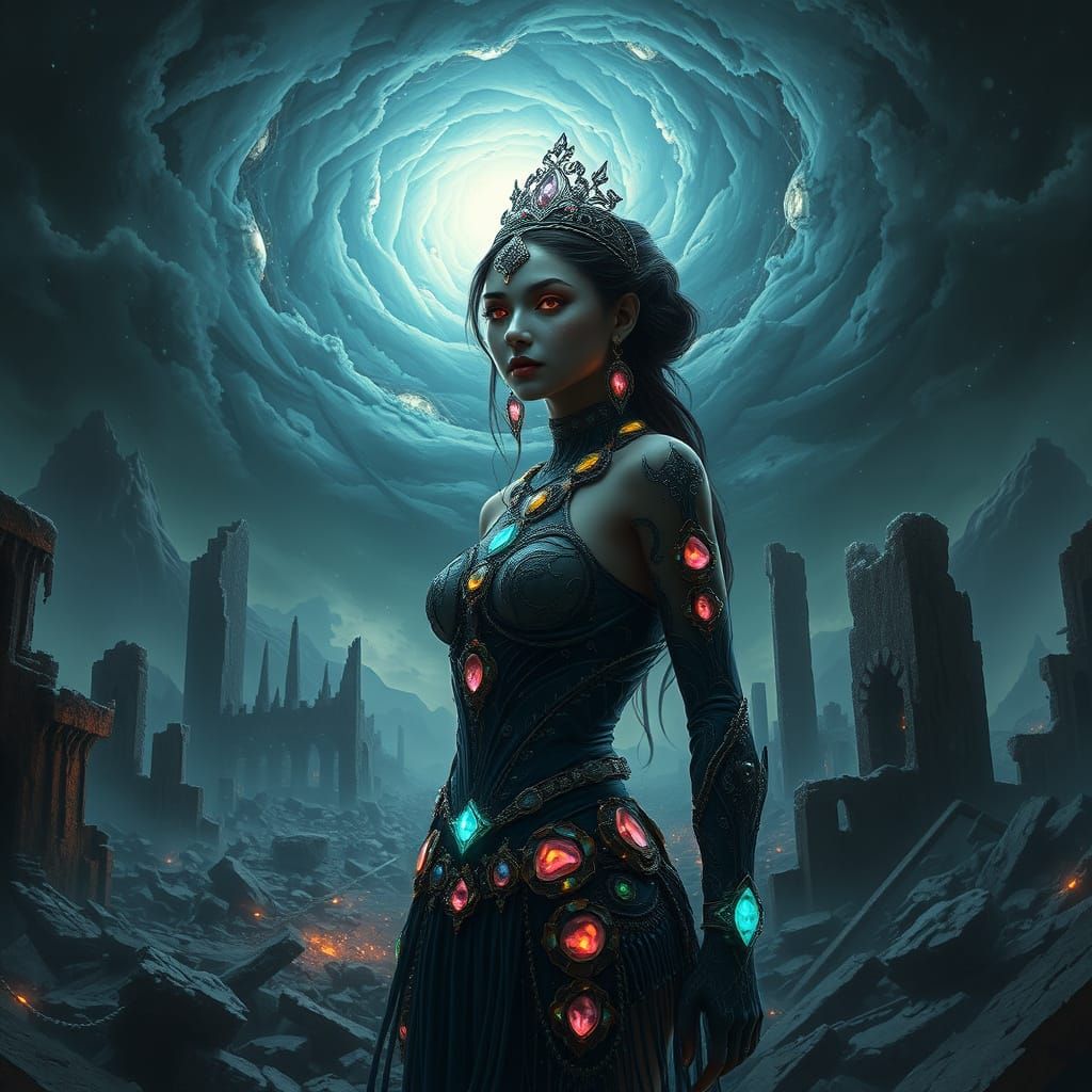 A digital painting of a cyborg princess in a ruined kingdom. The princess is adorned with colorful jewels and a neon glow, set against a dark, swirling sky. Rendered in dark fantasy concept art.
