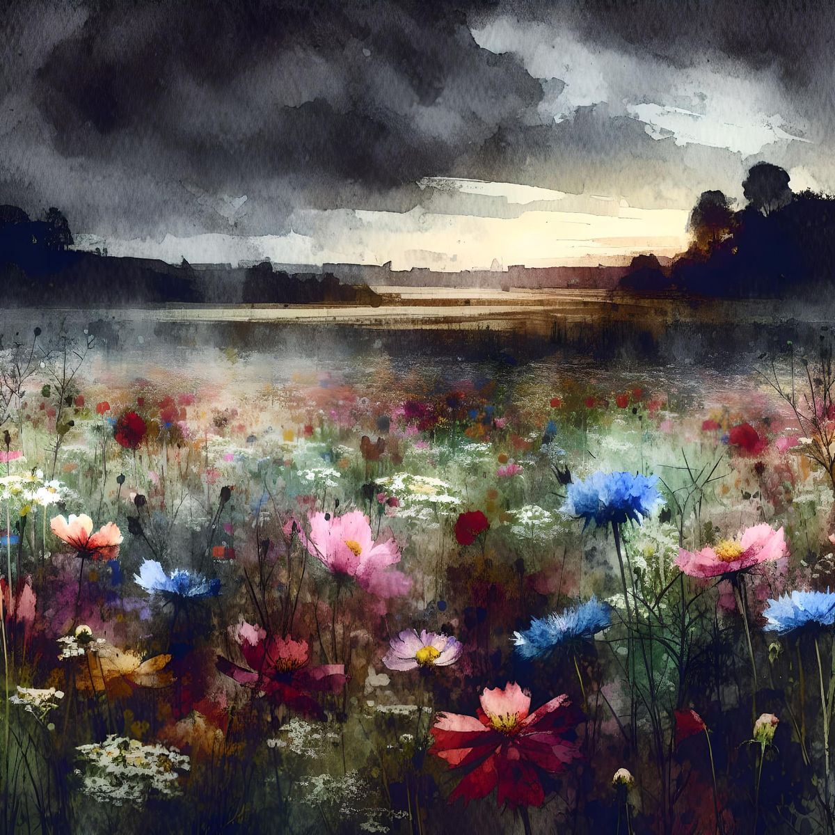 A striking picture of a field full of colorful wildflowers under a dark and ominous sky. This watercolor art captures the delicate textures and dramatic atmosphere of the scene, rendered as a watercolor painting.