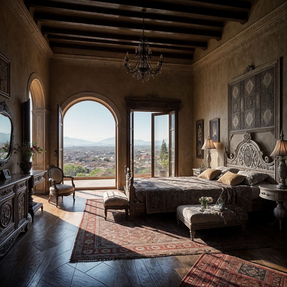 Create your dream Andalusian-style bedroom with furniture and views. Free and easy AI image generation.